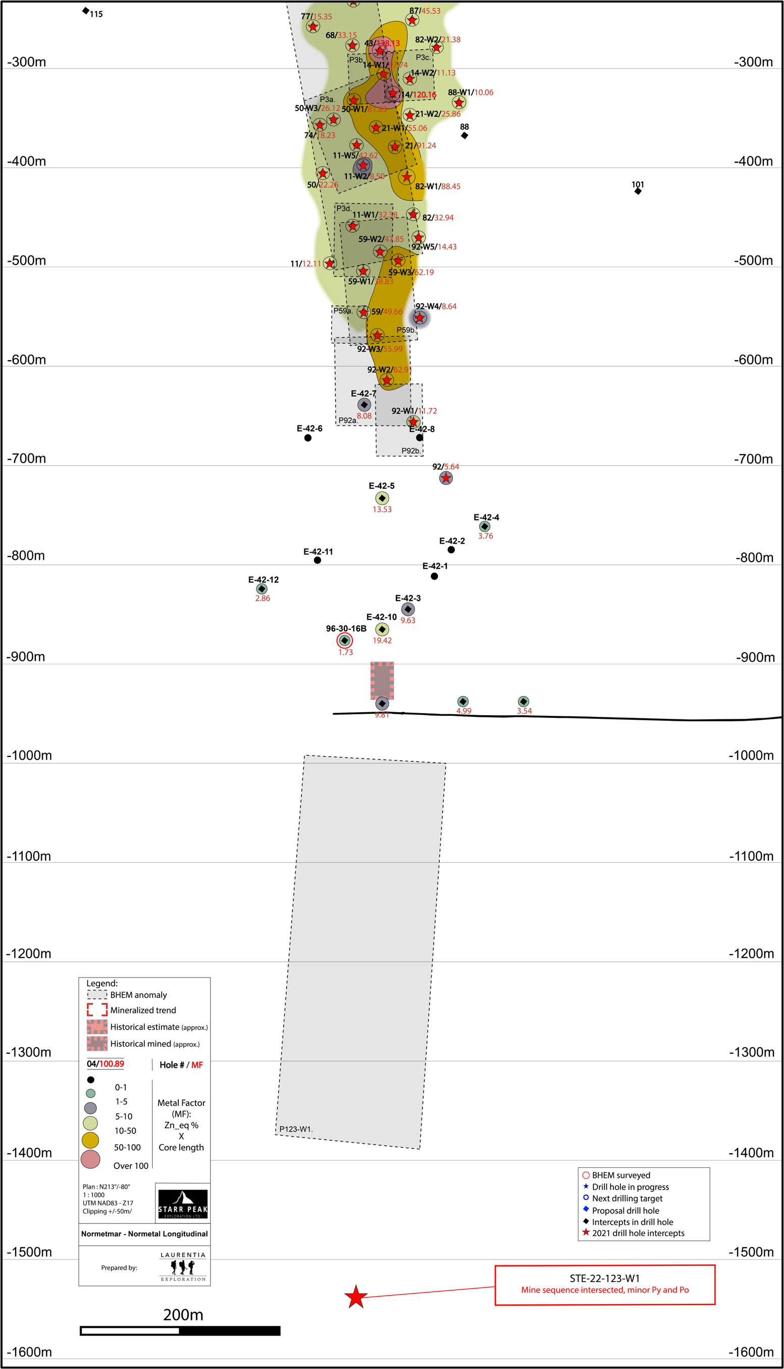 Deep hole STE-22-123-W1 was drilled parallel to the favourable horizon down to a depth of 1,850 meters vertical and intercepted sulfides along with the favourable mine sequence. Geophysic BHEM1 survey revealed a new untested anomaly (P123-W1.) centralised at a vertical depth of 1,550 meters and characterized by a mid-conductance of 150 siemens and dimensions of 150 meters wide by 400 meters long. This anomaly plate is the probable continuity of the mineralized system at depth underneath the historical mining drift from Normétal to Normetmar (Level 1,270m). (Figure 1)